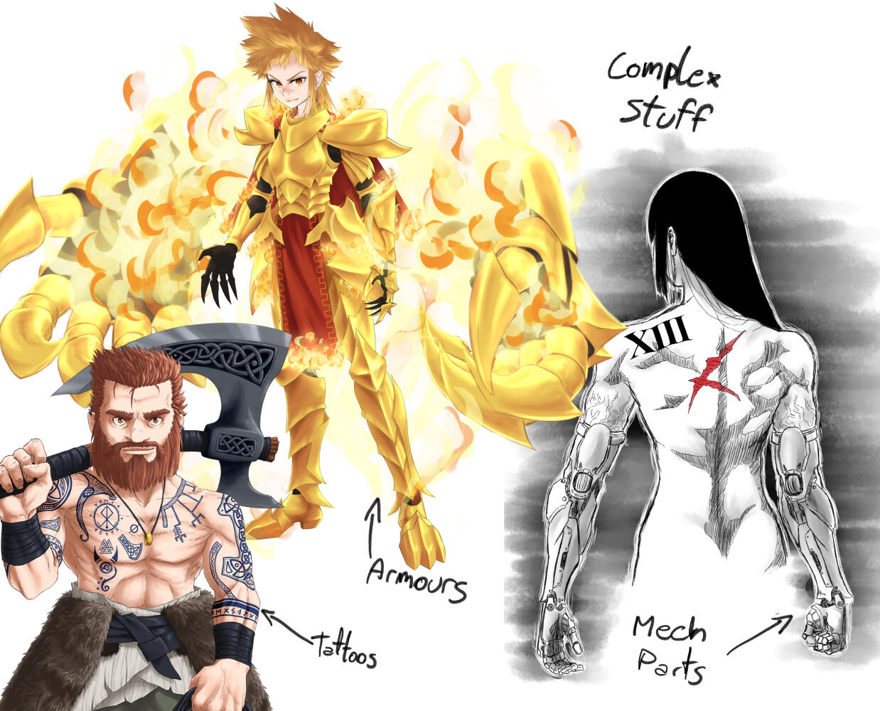 Characters with detailed armours, tattoos or mechanical parts can be considered a complex character.